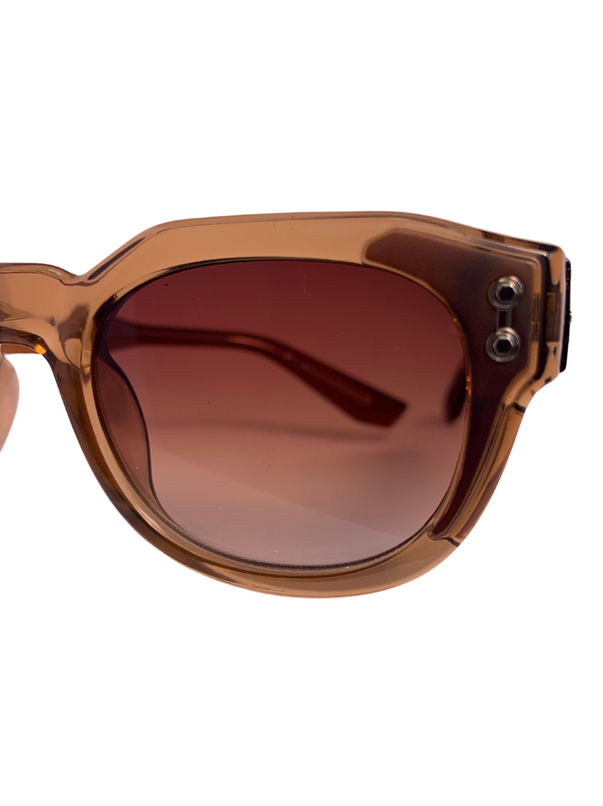 Detalhes frontais: em material opaco nas laterais externas, contrastando com o acetato marrom translúcido.